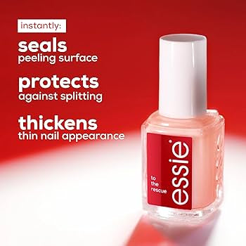 Essie to the rescue er viðgerðarmeðferð eftir notkun UV gels. Formúlan er sérstaklega þróuð með þrefaldri próteinblöndu, MSM og keramíðum. Þessi klínískt prófaða meðferð hjálpar til við að bæta sýnileg merki vegna UV gel skemmda á aðeins 5 dögum. Hún lokar nöglum sem eru að flagna, verndar gegn klofningi, þykkir útlit þunnra nagla og myndar þykkt verndarlag. Meðferðin gefur náttúrulega, glansandi og hálfgagnsæja áferð og má nota eitt og sér eða undir litað naglalakk.